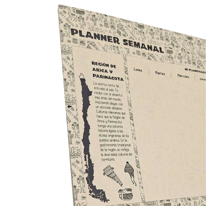 ¡Descubre nuestro nuevo planner de regiones de Chile, donde la cultura Chilena toma aún mas relevancia ! Sumérgete en las fascinantes tierras chilenas a través de nuestras regiones de Chile y conoce tips y datos de cada una de ellas. Además, este planner está hecho con papel eco-amigable, demostrando nuestro compromiso con el medio ambiente.